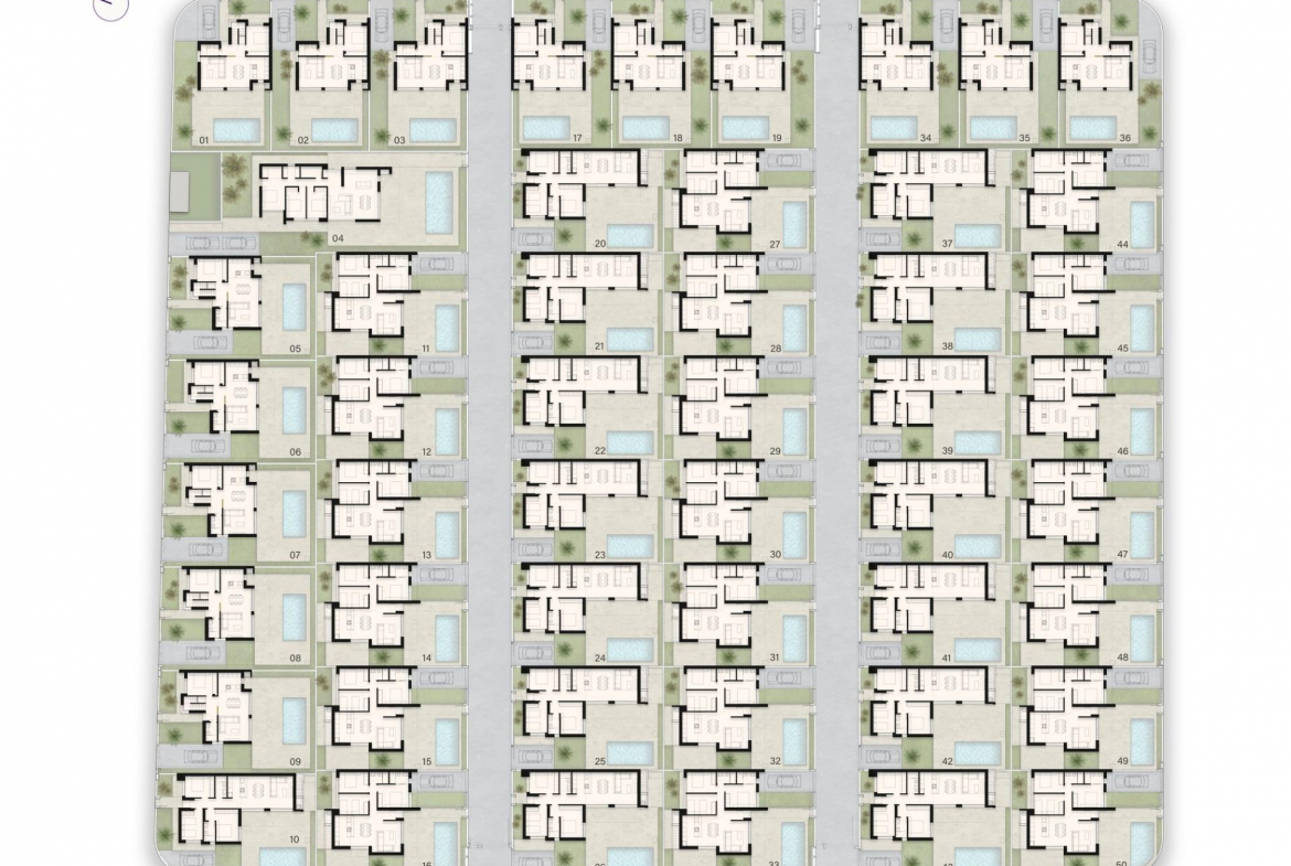 Bungalowy: Jednostki na parterze z prywatnymi ogrodami lub opcje na najwyższym piętrze z solariami. Wszystkie bungalowy obejmują dwie sypialnie, dwie łazienki, miejsce parkingowe i pomieszczenie gospodarcze, rozmieszczone wokół centralnego obszaru wspólnego z basenem i zagospodarowanymi ogrodami.