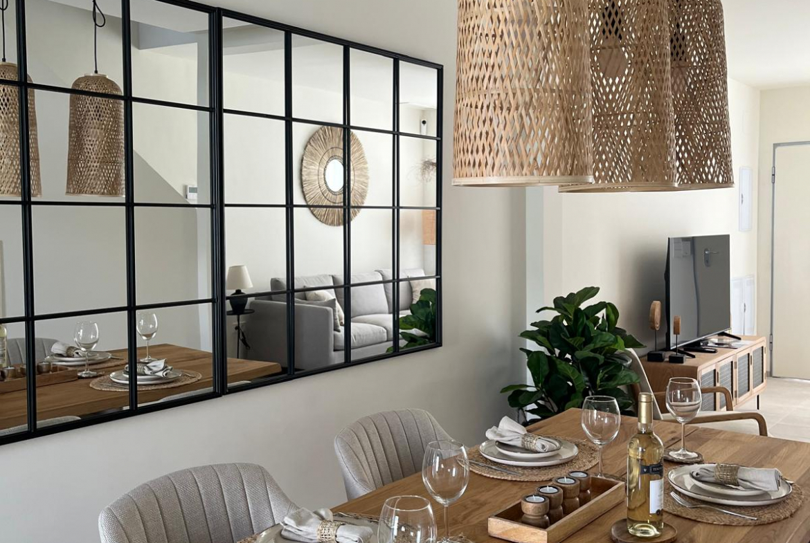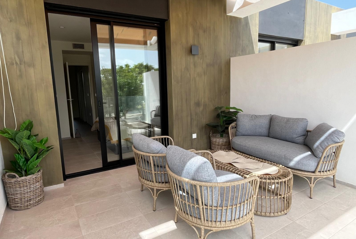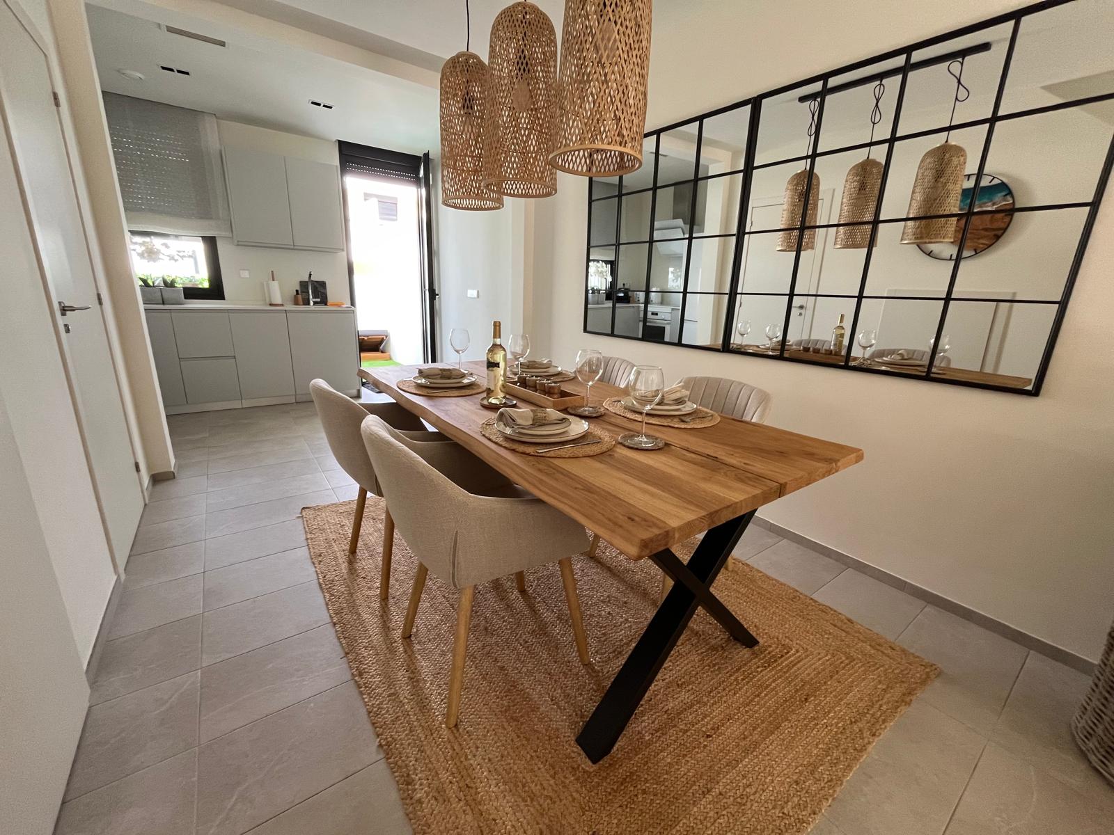 Na sprzedaż w pełni umeblowany, nowoczesny dom szeregowy z 2024 roku, zlokalizowany w spokojnej okolicy Pilar de la Horadada, w południowej części Costa Blanca. Nieruchomość znajduje się w zamkniętym kompleksie złożonym z 10 dwupoziomowych apartamentów.