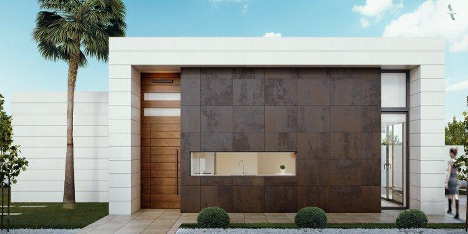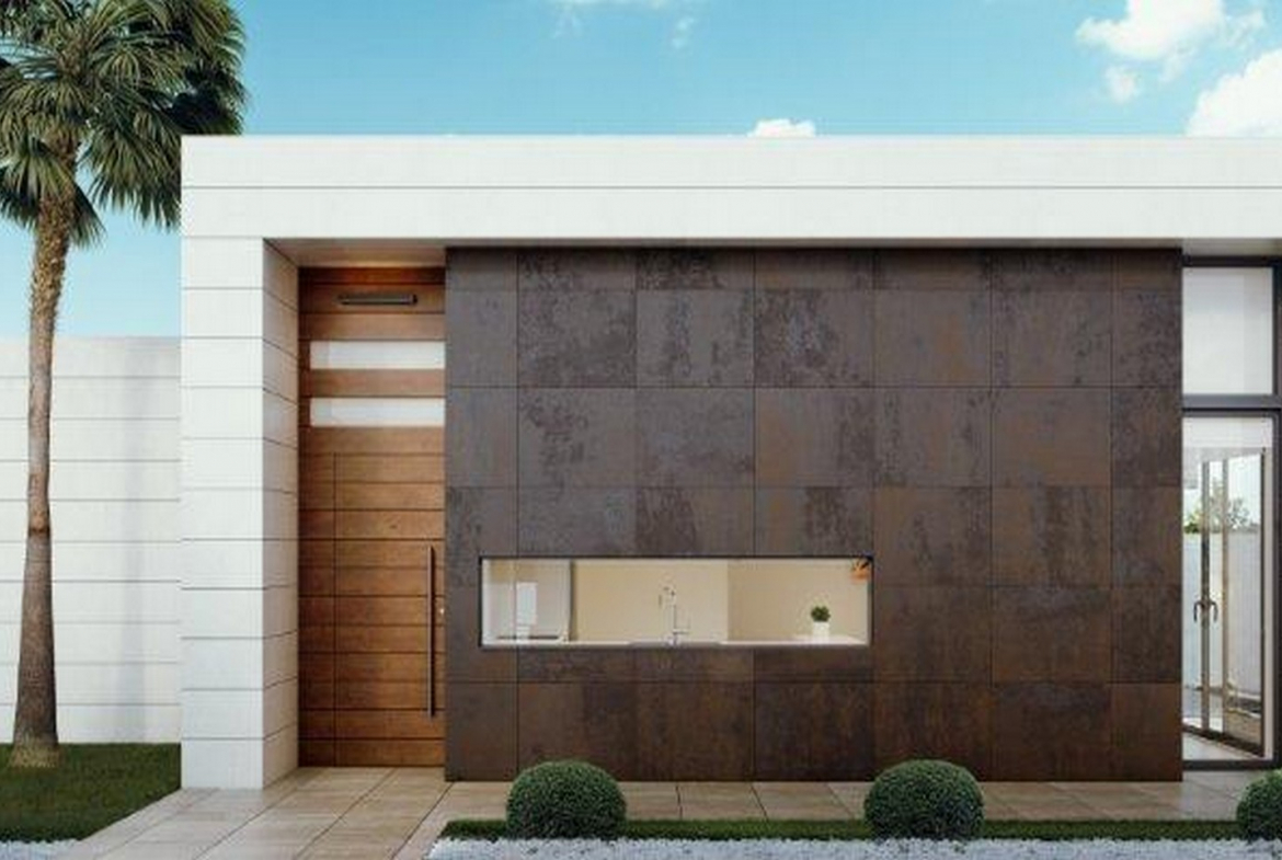 Wykończenie elewacji stanowi jasny kamień naturalny oraz elementy z wielkoformatowych płyt wysokiej jakości.