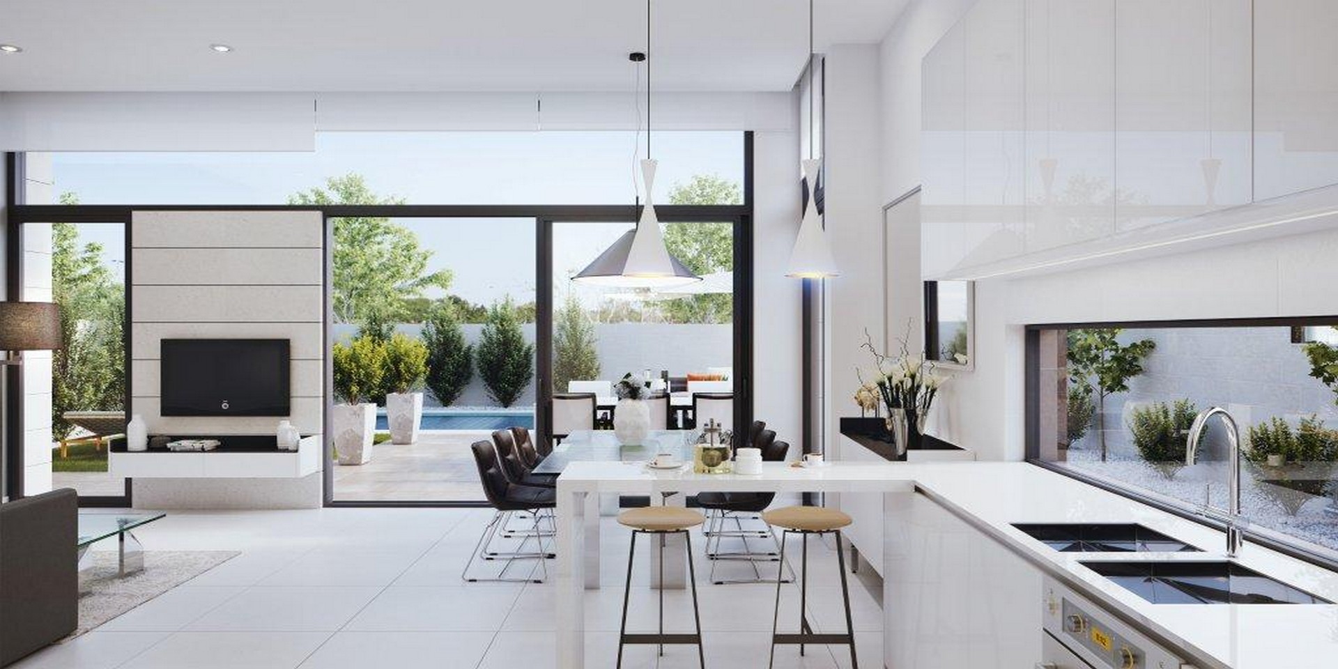 Prywatny ogród z trawnikiem syntetycznym, taras oraz basen.