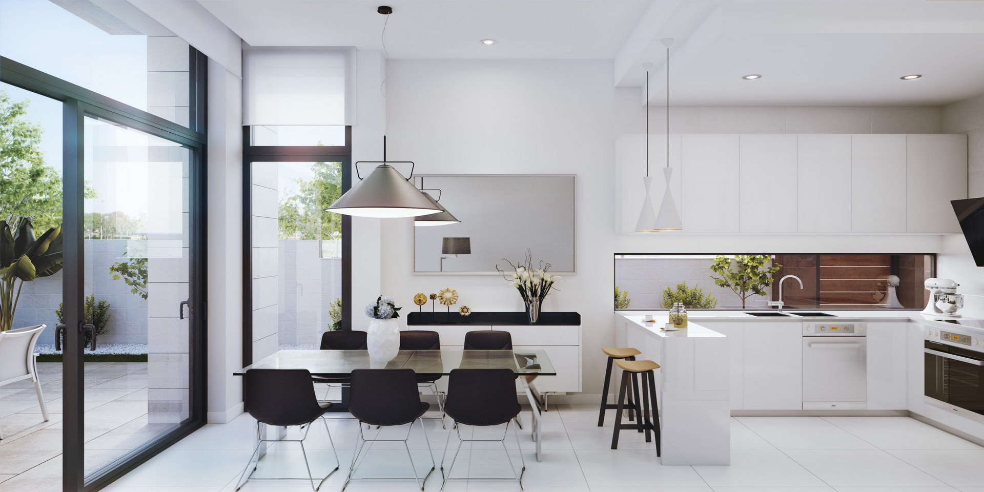 Przestronny salon o podwójnej wysokości oraz naturalne światło w łazienkach.