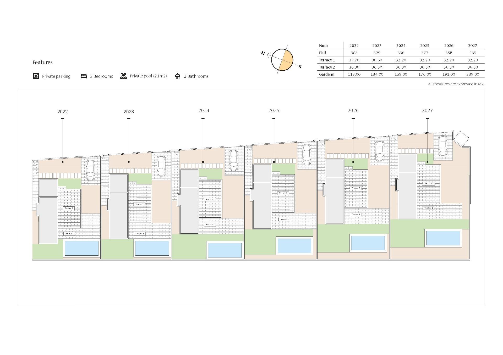 Wille zbudowane na 2 piętrach, mają 3 sypialnie, 2 łazienki, kuchnię z otwartą przestrzenią i salonem, gdzie znajdują się duże okna z bezpośrednim dostępem do tarasu i basenu.