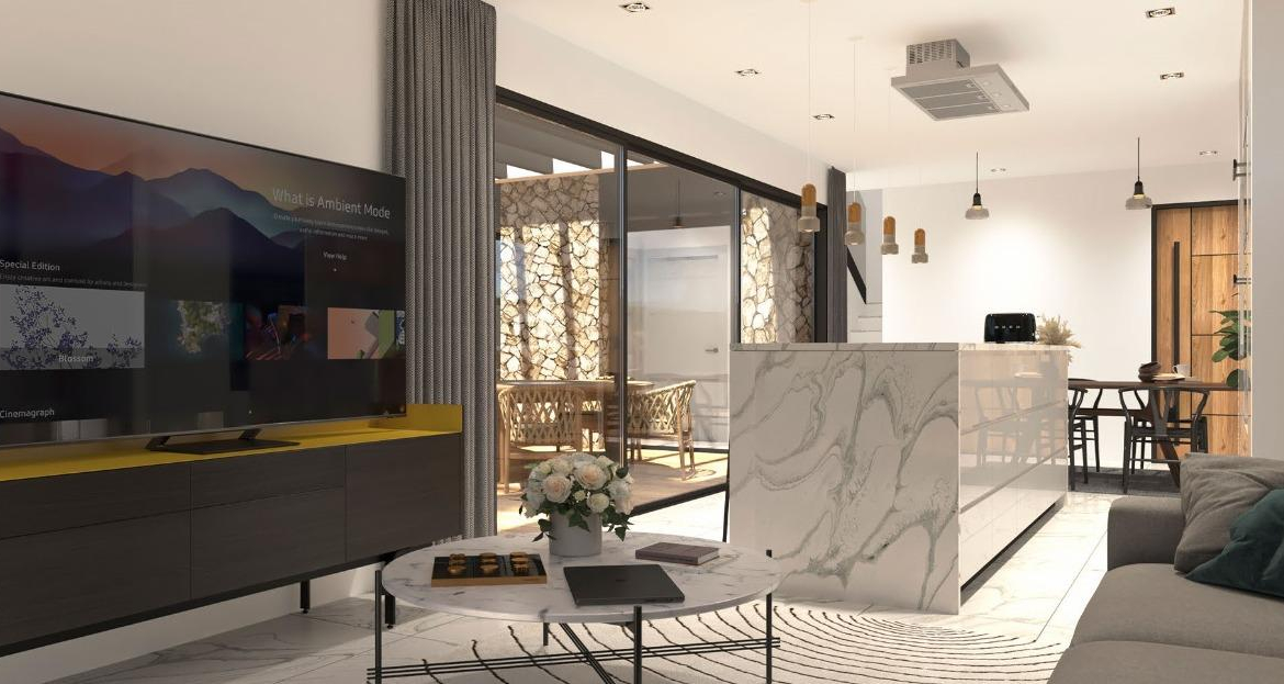 Wille zbudowane są na 2 poziomach, mają 3 sypialnie, 3 łazienki, otwartą kuchnię z salonem, wbudowane szafy i taras.