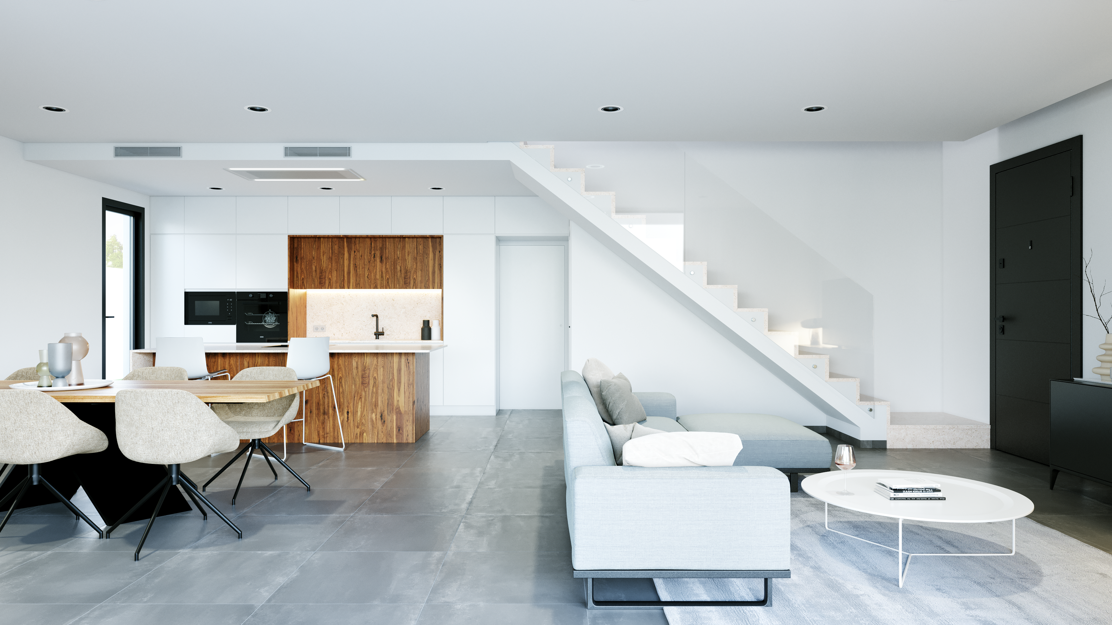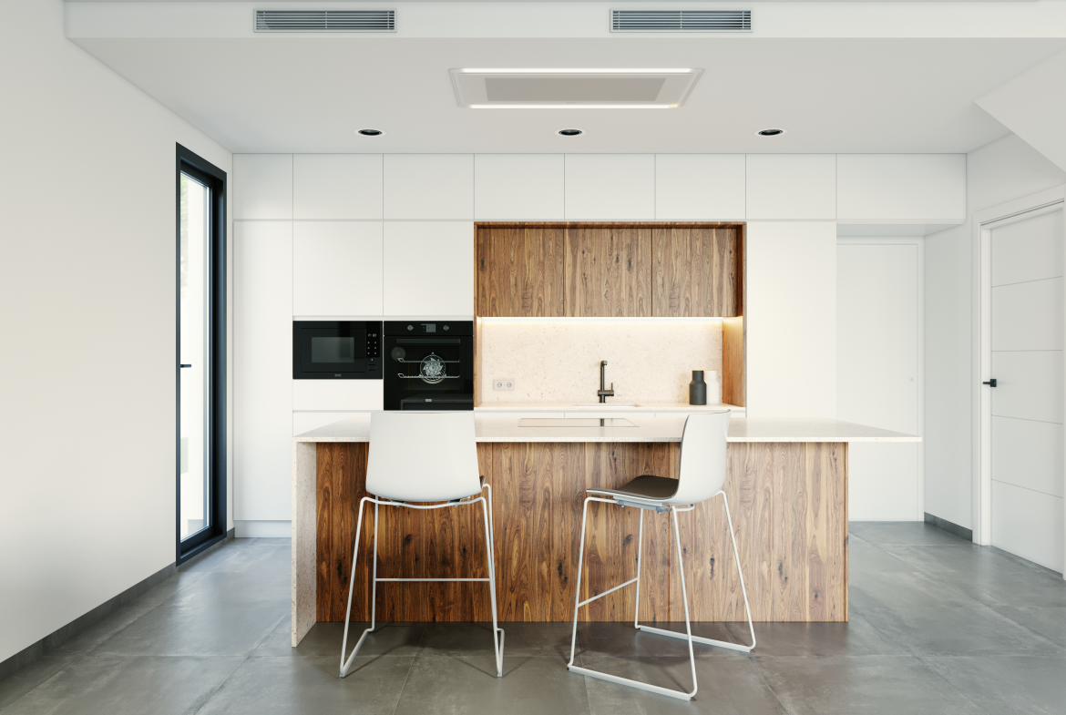 - Kuchnia w pełni umeblowana z blatem z ultrakompaktowej powierzchni (np. Silestone), wyposażona w sprzęt AGD, w tym: lodówka, płyta indukcyjna na wyspie, okap wbudowany w sufit, piekarnik, mikrofalówka oraz zmywarka.