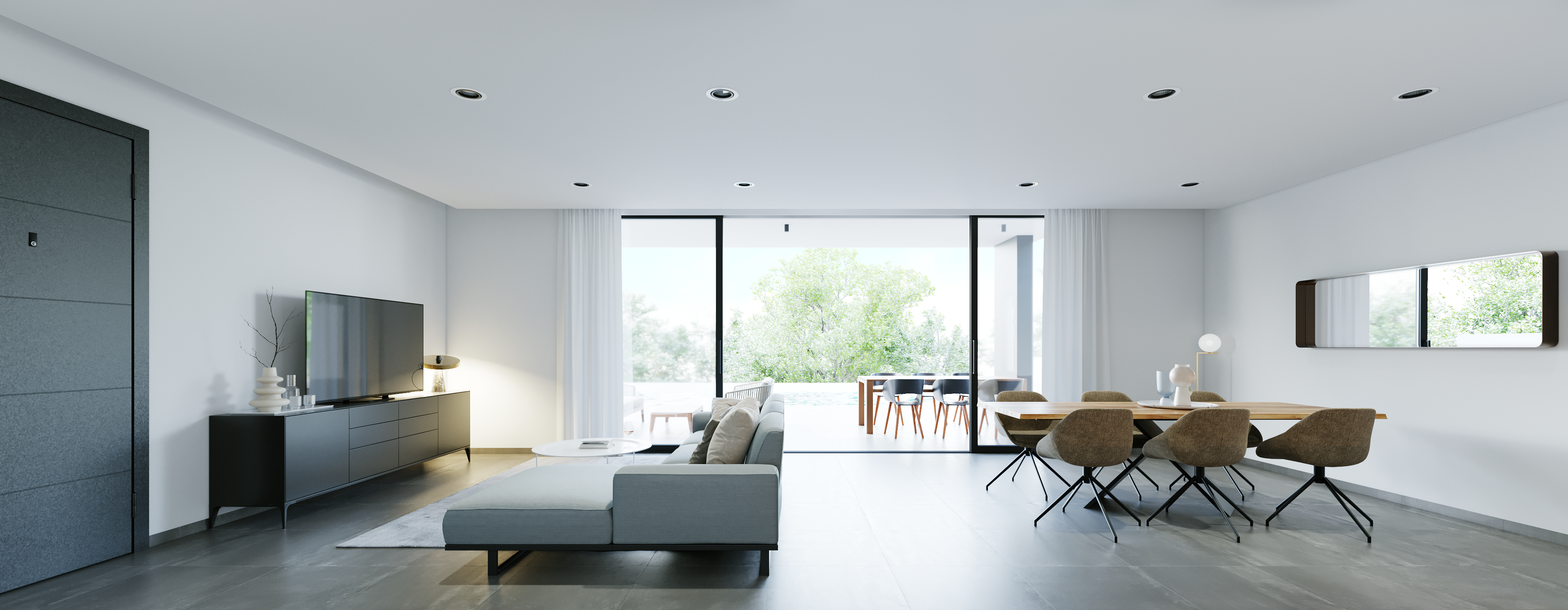 - Stolarka zewnętrzna z lakierowanego aluminium w kolorze antracytowym z podwójnymi szybami Climalit.