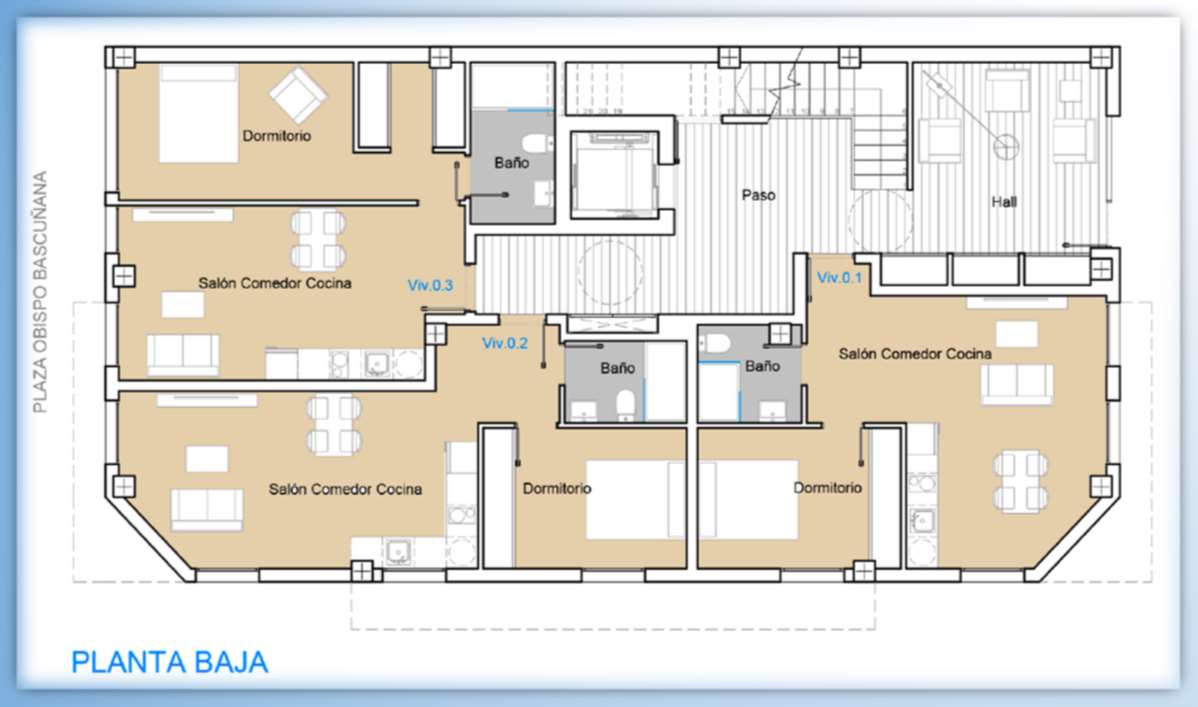 - 3 apartamenty: każda jednostka składa się z jednej sypialni, salonu z otwartą kuchnią i jadalnią oraz łazienki