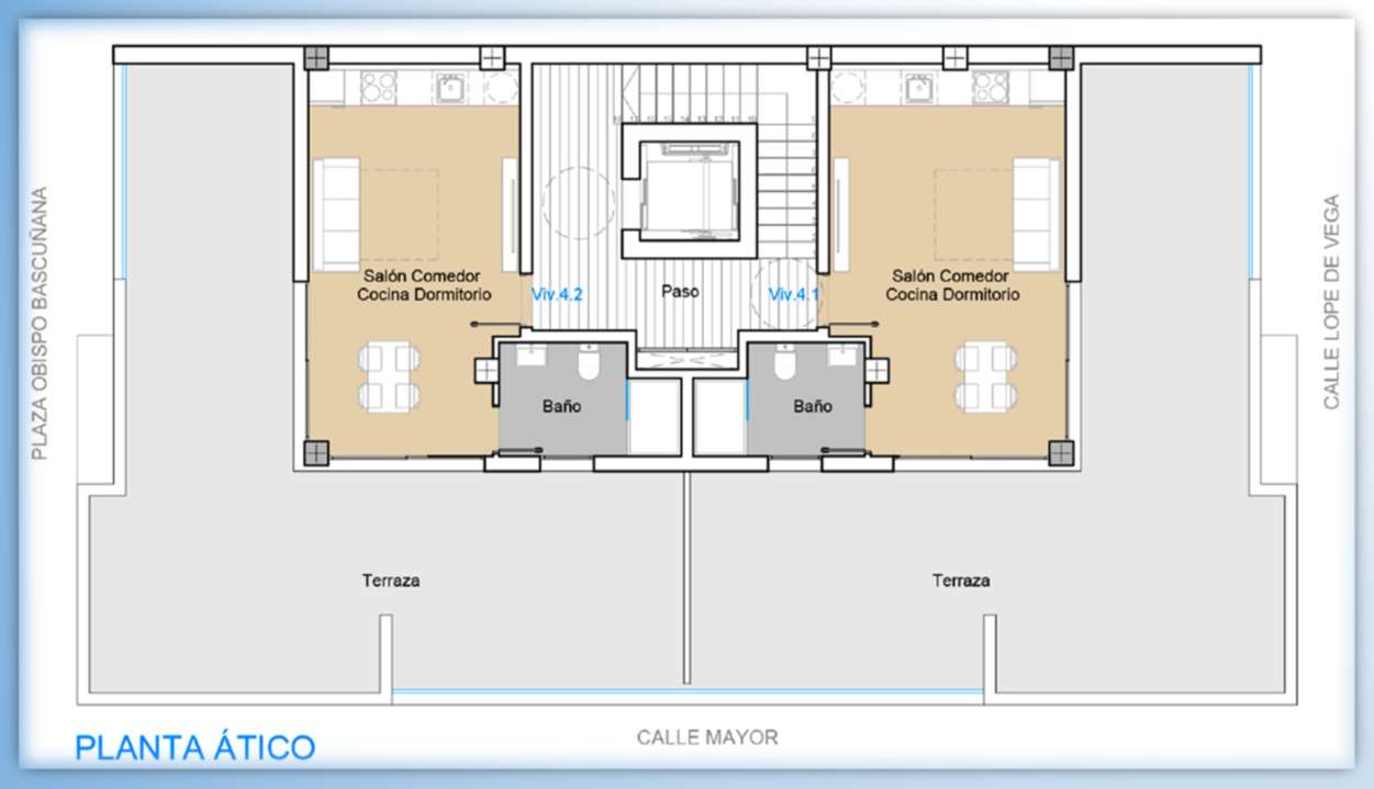 - 2 luksusowe penthouse’y: każdy wyposażony w salon z miejscem na rozkładaną sofę, otwartą kuchnię z jadalnią, łazienkę i przestronny taras