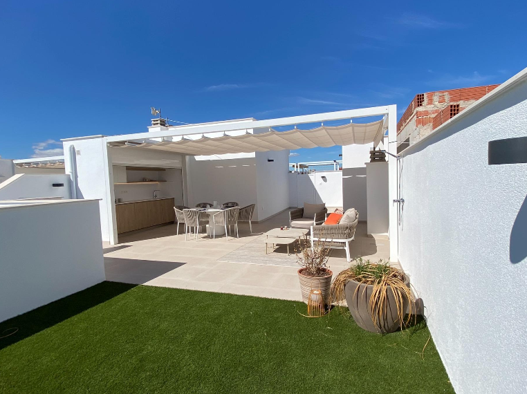 Bungalowy na najwyższym piętrze z 2 sypialniami, 2 łazienkami i rozległym prywatnym solarium na dachu, w komplecie z letnią kuchnią, pergolą i toaletą dla gości.