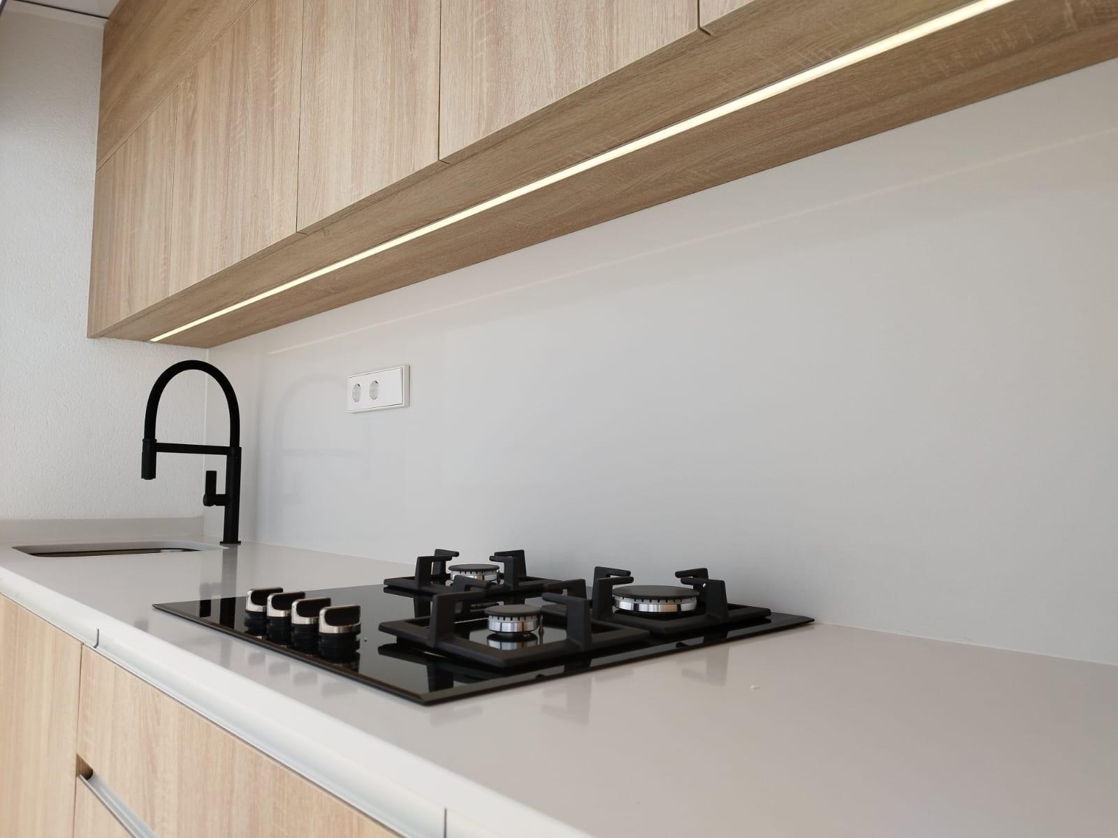 Kuchnia jest w pełni umeblowana, w wykończeniu na wysoki połysk w kolorze białym lub w wersji drewnianej, i wyposażona w płytę indukcyjną z wbudowanym okapem, piekarnik, kuchenkę mikrofalową, pralkę, lodówkę oraz zmywarkę w zabudowie. W całym domu zainstalowana jest klimatyzacja kanałowa.