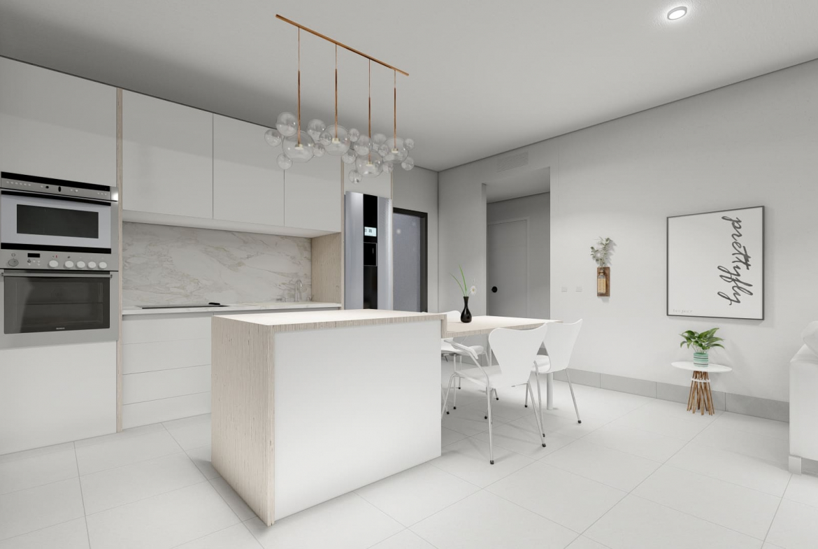 - Nowoczesny, otwarty układ z w pełni wyposażoną kuchnią i przestrzenią dzienną