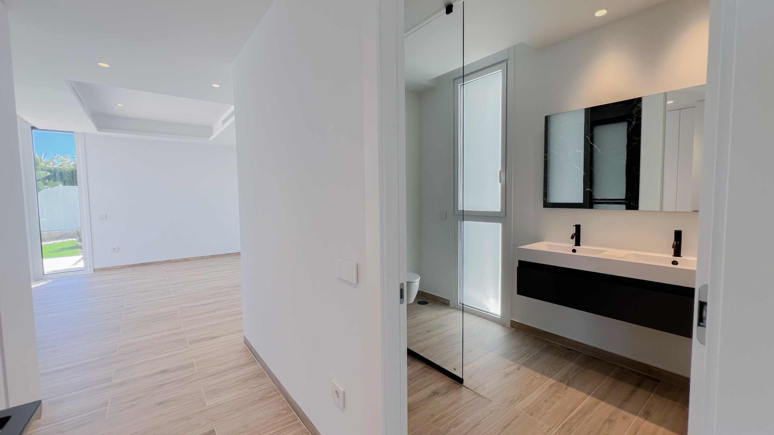 Na parterze znajduje się toaleta dla gości, przestronna pralnia z wyjściem na taras, jedna sypialnia z szafami w zabudowie i łazienką en suite, a także zamknięta kuchnia o dużej powierzchni. Cała przestrzeń parteru posiada przeszklenia od podłogi do sufitu, co zapewnia maksymalne doświetlenie wnętrz i bezpośredni dostęp do tarasów oraz basenu.
