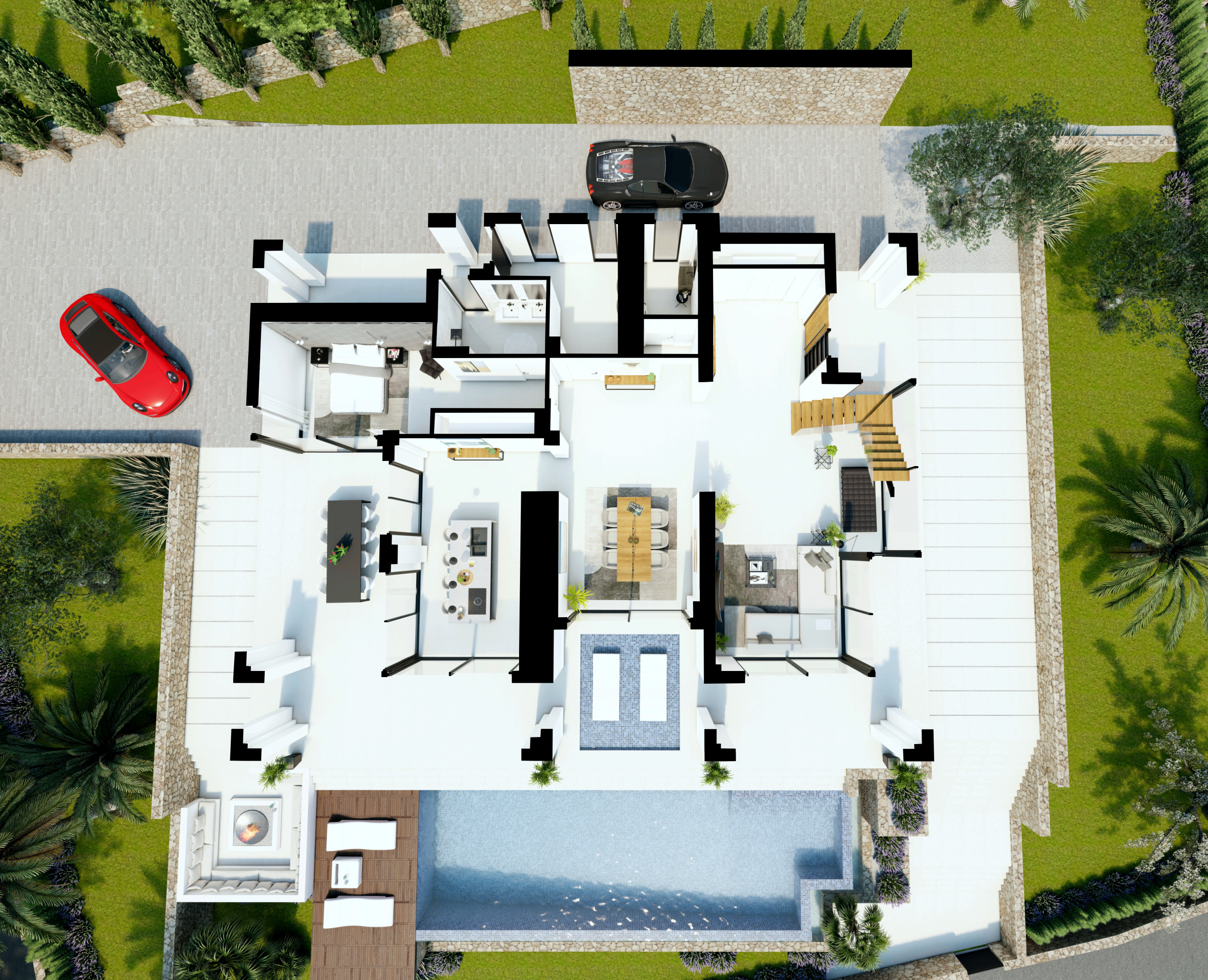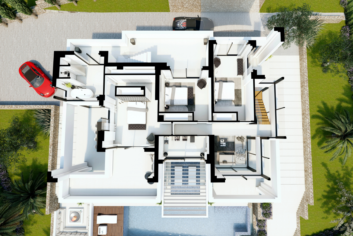 Wszystkie sypialnie wyposażone są w zabudowane szafy. Z każdego z pomieszczeń rozpościera się widok na ogród i basen typu infinity. W ogrodzie znajduje się również strefa relaksu z zewnętrznym kominkiem.