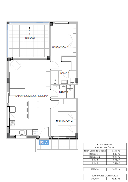 • Każde mieszkanie posiada 2 sypialnie i 2 łazienki