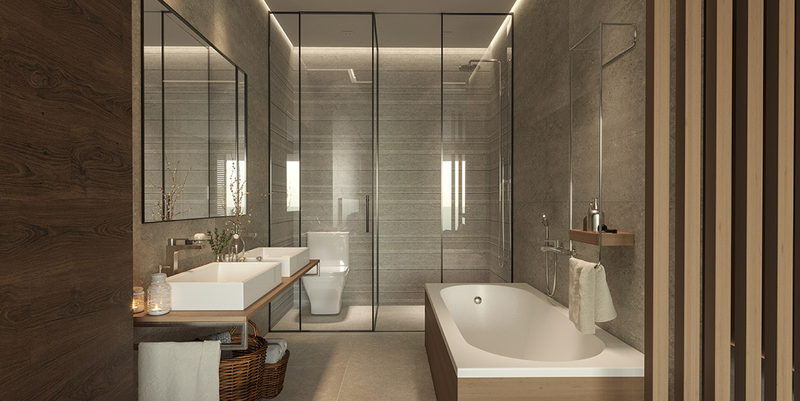 • Łazienki z armaturą Jacob Delafon i blatami Solid Surface.