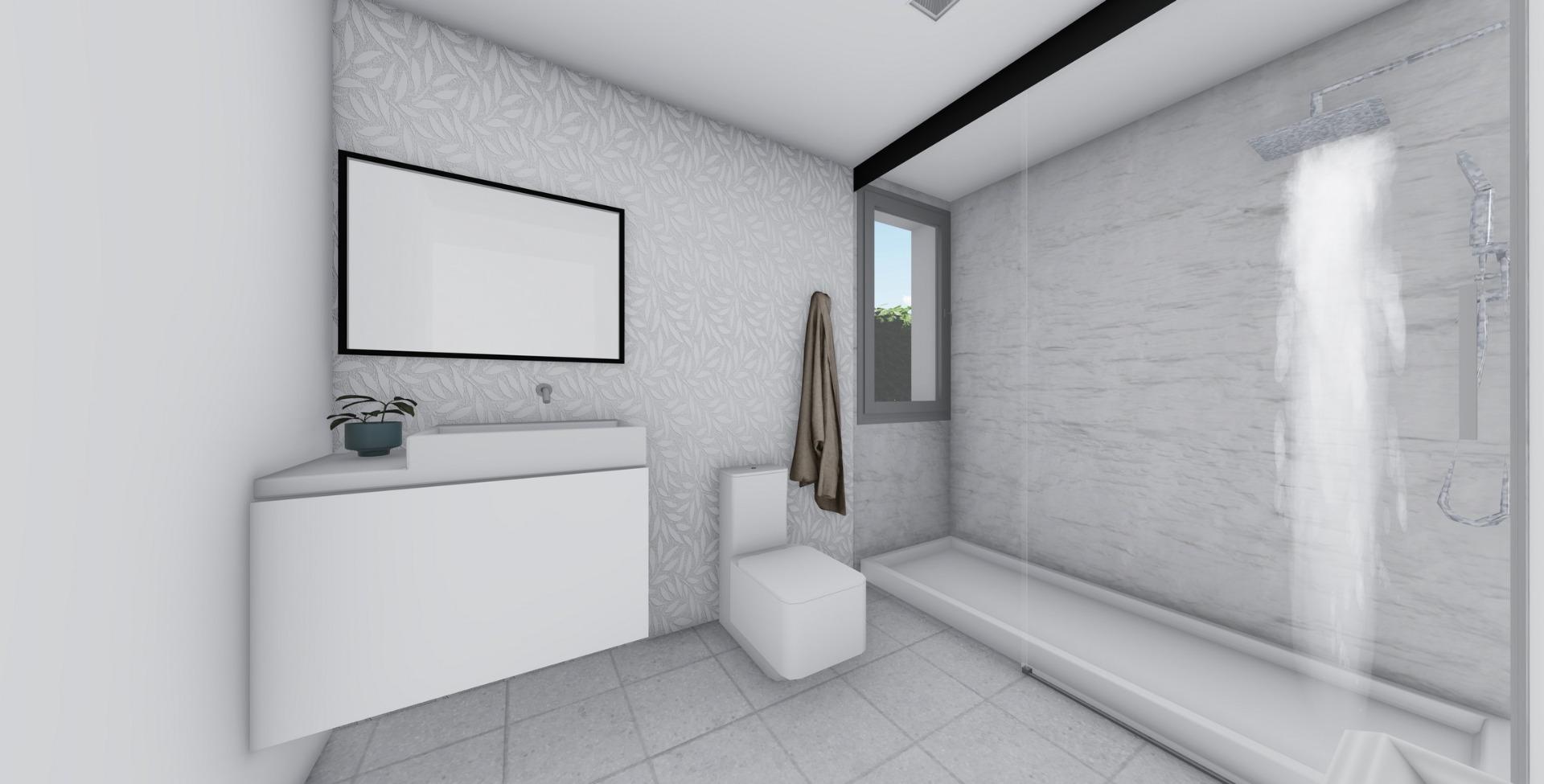 Kuchnia umeblowana z blatem i frontem Silestone, sprzętem AGD (pralka, piekarnik, płyta ceramiczna, okap, zmywarka, lodówka i grzejnik aerotermalny).