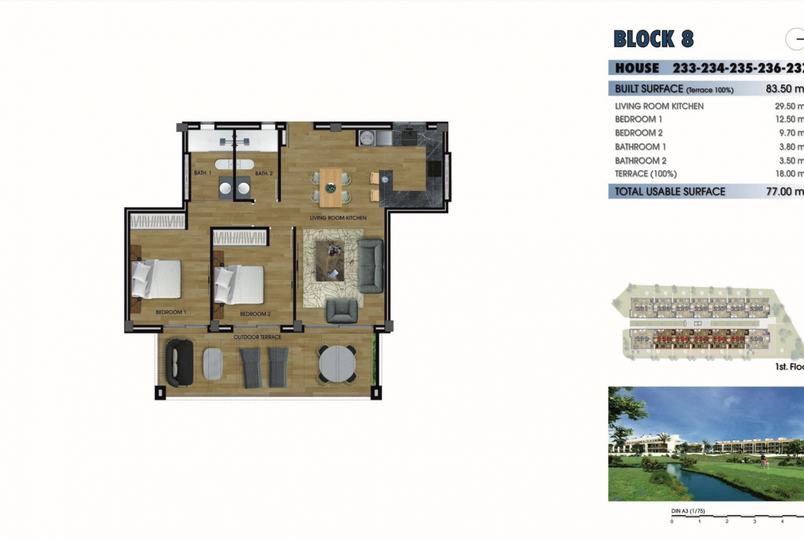 Ten niesamowity kompleks będzie składał się z 244 apartamentów z 2 i 3 sypialniami, podzielonych na 8 bloków i 20 prywatnych willi.